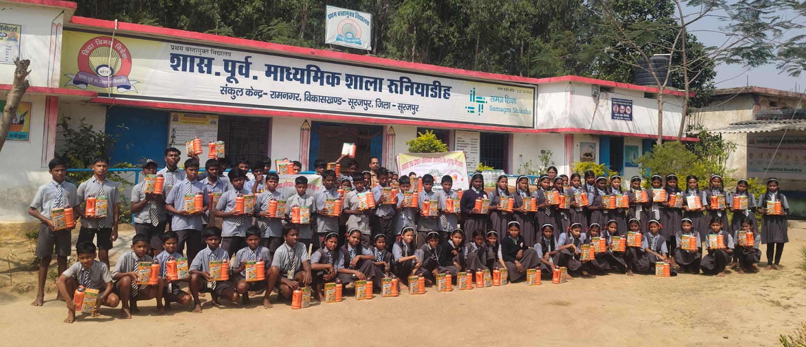 सूरजपुर/बिश्रामपुर। क्षेत्र के प्रथम बस्तामुक्त विद्यालय शासकीय पूर्व माध्यमिक शाला रुनियाडीह को डाबर प्राइवेट इंडिया लिमिटेड के सौजन्य से युवा साथी फाउंडेशन के संस्थापक डॉ. रजनीश गर्ग द्वारा डाबर कंपनी के विभिन्न उत्पाद उपलब्ध कराए गए। माध्यमिक शाला रुनियाडीह के प्रधान पाठक सीमांचल त्रिपाठी द्वारा बताया गया कि क्षेत्र में पड़ रही गर्मी को देखते हुए बच्चों को गर्मी से राहत दिलाने व डिहाइड्रेशन से बचाने तथा उन्हें स्वच्छता के प्रति जागरूक करने के उद्देश्य से माध्यमिक शाला रुनियाडीह में अध्यनरत समस्त 72 बच्चों सहित माध्यमिक शाला रामनगर में अध्यनरत 116 बच्चों के लिए डाबर के सी एस आर मद से ब्रश, डाबर लाल दंत मंजन 200 ग्राम पेस्ट, आम का जूस, एक किलो ग्लूकोज, स्नान करने का साबुन, नारियल तेल, नारियल पानी, शहद, सरसों का तेल तथा विद्यालयीन स्वच्छता खातिर हार्पिक, हैंडवॉश, रूम फ्रेशनर, मच्छरों से बचाव खातिर इलेक्ट्रिक ऑडोमास निःशुल्क प्रदान किया गया। विदित हो कि बस्तामुक्त विद्यालय के प्रधान पाठक सीमांचल त्रिपाठी की मांग पर रामनगर माध्यमिक शाला को भी सामग्री उपलब्ध कराए गए हैं। रुनियाडीह ग्राम सरपंच श्रीमती सुमित्रा सिंह द्वारा रजनीश गर्ग के कार्य की प्रशंसा करते हुए अनुकरणीय बताया। इस दौरान रामनगर माध्यमिक शाला के प्रधान पाठक राम चरण सिंह, रिजवान अंसारी, श्रीमती एम. टोप्पो, पूनम गुप्ता सहित मध्याह्न भोजन पकाने वाली सहायिका श्रीमती सुमित्रा राजवाड़े तथा नान दईया उपस्थित रहे। डाबर के विभिन्न उत्पाद मिलने से बच्चों के चेहरे पर खुशी देखने को मिली। उपस्थित पालकों को भी आम जूस तथा ग्लूकोज वितरण किया गया।