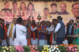 सूरजपुर अनिल साहू 09 जनवरी जमदेई, जयनगर क्षेत्र, ’’अखिल भारतीय बिझिया समाज’’ के महासम्मेलन कार्यक्रम में मुख्यमंत्री श्री विष्णु देव साय ने मुख्य अतिथि के तौर पर अपनी उपस्थिति दर्ज करायी। इस अवसर पर कार्यक्रम में बिंझिया समाज के अतिरिक्त संवरा, धागड़, गोड, धनुहार, भुईया, पन्डो, खेरवार, अमनित, कोडा, बिरजिया देहारी कोरवा, सनसारी उरांव, चिक-चिकवा, मलार, अगरिया इत्यादि जनजाति समुदाय द्वारा मुख्यमंत्री का स्वागत परम्पागत तरीकों से किया गया। अधिकार वंचित आदिवासी संघर्ष समिति के बैनर तले आयोजित अखिल भारतीय बिंझिया समाज महासम्मेलन पर मुख्यमंत्री ने कार्यक्रम में उपस्थित जनों को सम्बोधित करते हुए कहा कि हमने शपथ के बाद पहला कार्य किसानों के हित में लिया। मोदी की गारंटी के तहत किसानों के धान को 3100 रुपये प्रति किवंटल की दर से खरीद रहे हैं, श्री साय ने कहा कि सुशासन दिवस के दिन 12 लाख किसानों को बकाया बोनस राशि भी उनके खाते में डाली गई। श्री साय ने कहा कि वे जब केंद्र में राज्यमंत्री थे तब लगातार बिंझिया समाज सहित 12 जातियों को अनुसूचित जनजाति वर्ग में शामिल करने के लिए लगातार प्रयासरत थे। उन्होंने बताया कि लोकसभा व राज्यसभा में इस वर्ग की पीड़ा व समस्या को संसद में उठाया, तब जाकर आज बिंझिया समाज सहित 12 जनजातियों को विकास की मुख्यधारा में शामिल होने का अवसर मिला।