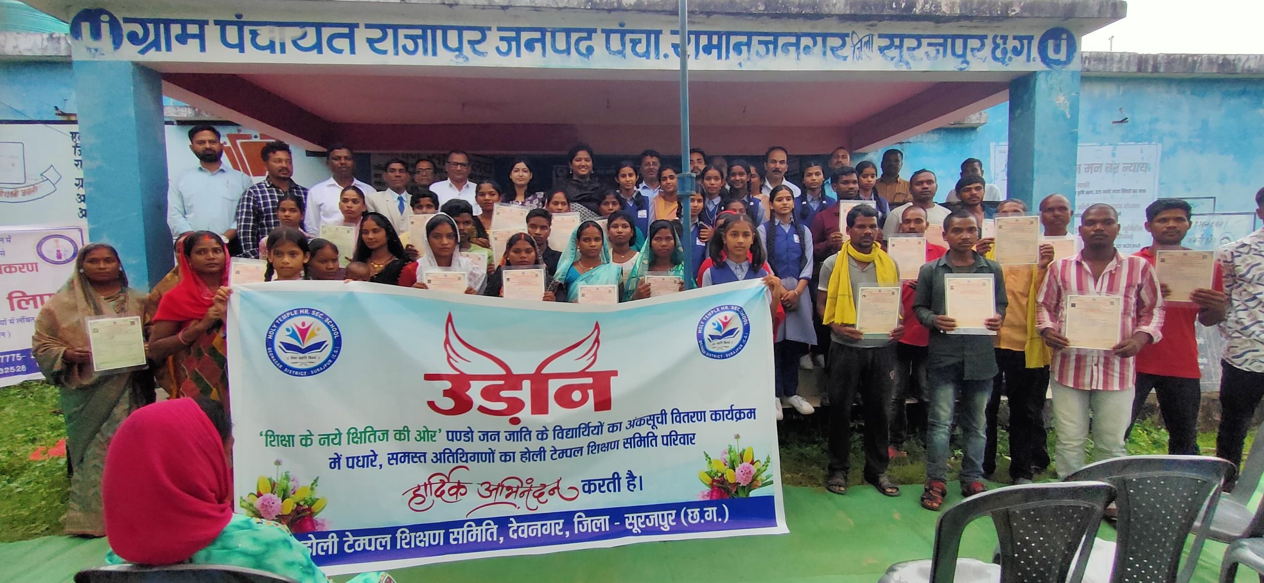 होली टेम्पल शिक्षण समिति द्वारा संचालित उड़ान कार्यक्रम अंतर्गत पण्डो जनजाति के विद्यार्थियों को अंकसूची वितरित की गई। समिति के संचालक ने बताया कि ग्राम राजापुर व आसपास के ग्रामीण जहां शिक्षा से वंचित थे, अब समिति के प्रयासों से फिर से पढ़ाई से जुड़े हैं। उल्लेखनीय है कि इस वर्ष कक्षा 10वीं के 35 और कक्षा 12वीं के 6 विद्यार्थी प्रथम श्रेणी में उत्तीर्ण हुए हैं।