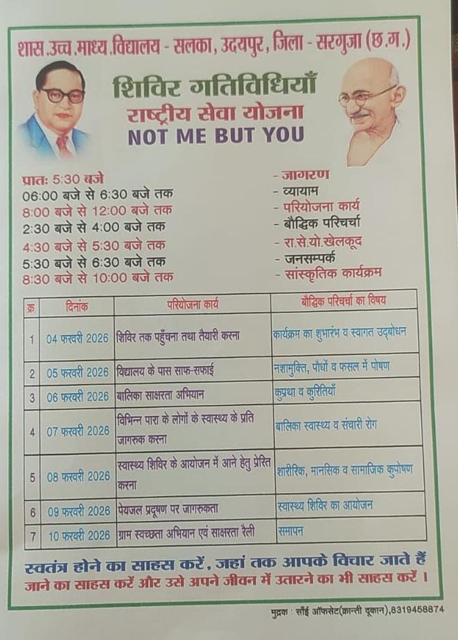 राष्ट्रीय युवा एवं खेल मंत्रालय नई दिल्ली द्वारा प्रायोजित एवं गेरा गुरु विश्वविद्यालय अंबिकापुर द्वारा आयोजित शासकीय उच्चतर माध्यमिक विद्यालय साल का उदयपुर की राष्ट्रीय सेवा योजना इकाई द्वारा प्रति वर्ष की भांति विश्वास भी साथ दिवसीय शिविर का आयोजन व्यक्तित्व विकास व बौद्धिक परिचर्चा विषय पर ग्राम पंचायत नमूना के शासकीय हाई स्कूल में 4 फरवरी 2026 से 10 फरवरी 2026 तक आयोजित किया गया है।