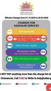 सूरजपुर। 01 अक्टूबर 2025 से 30 सितंबर 2028 तक विभिन्न आधार सेवाओं के लिए नया शुल्क प्रभावी होगा। यह बदलाव नागरिकों को बेहतर और अधिक कुशल सेवाएं प्रदान करने के उद्देश्य से किया गया है। नया शुल्क के अनुसार (5-7 वर्ष और 15-17 वर्ष) के लिए नया आधार नामांकन और अनिवार्य बायोमेट्रिक अपडेट पूरी तरह से निःशुल्क रहेंगे। वयस्कों के लिए अन्य बायोमेट्रिक अपडेट (जैसे, उंगलियों के निशान, आईरिस स्कैन) की शुल्क 125 रू. होगी।