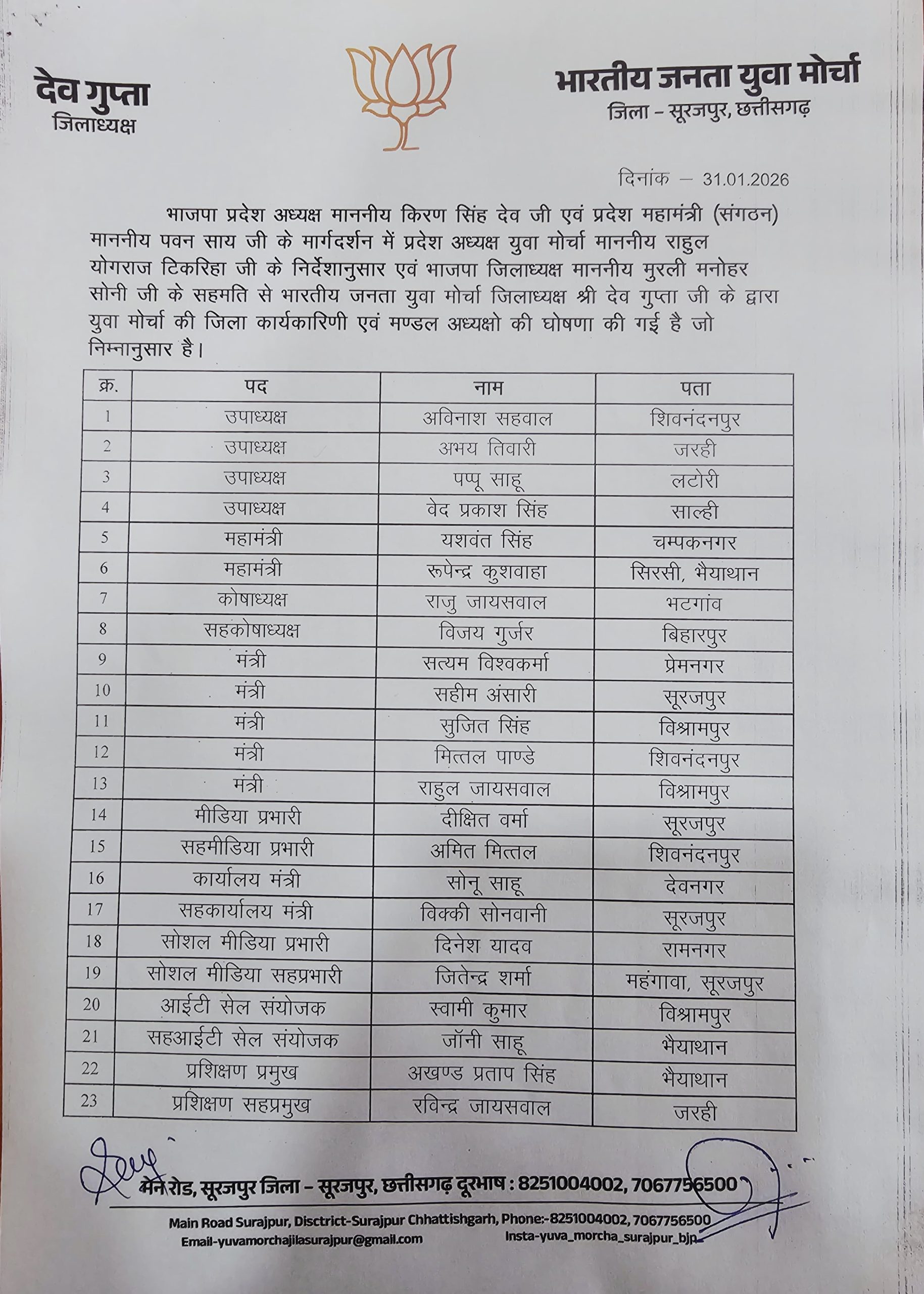 भाजपा युवा मोर्चा की जिला व मंडल कार्यकारिणी घोषित: सभी पदाधिकारियों के नाम जारी भाजयुमो जिलाध्यक्ष देव गुप्ता के नेतृत्व में संगठन को मिली नई मजबूती February 1, 2026 No Comments